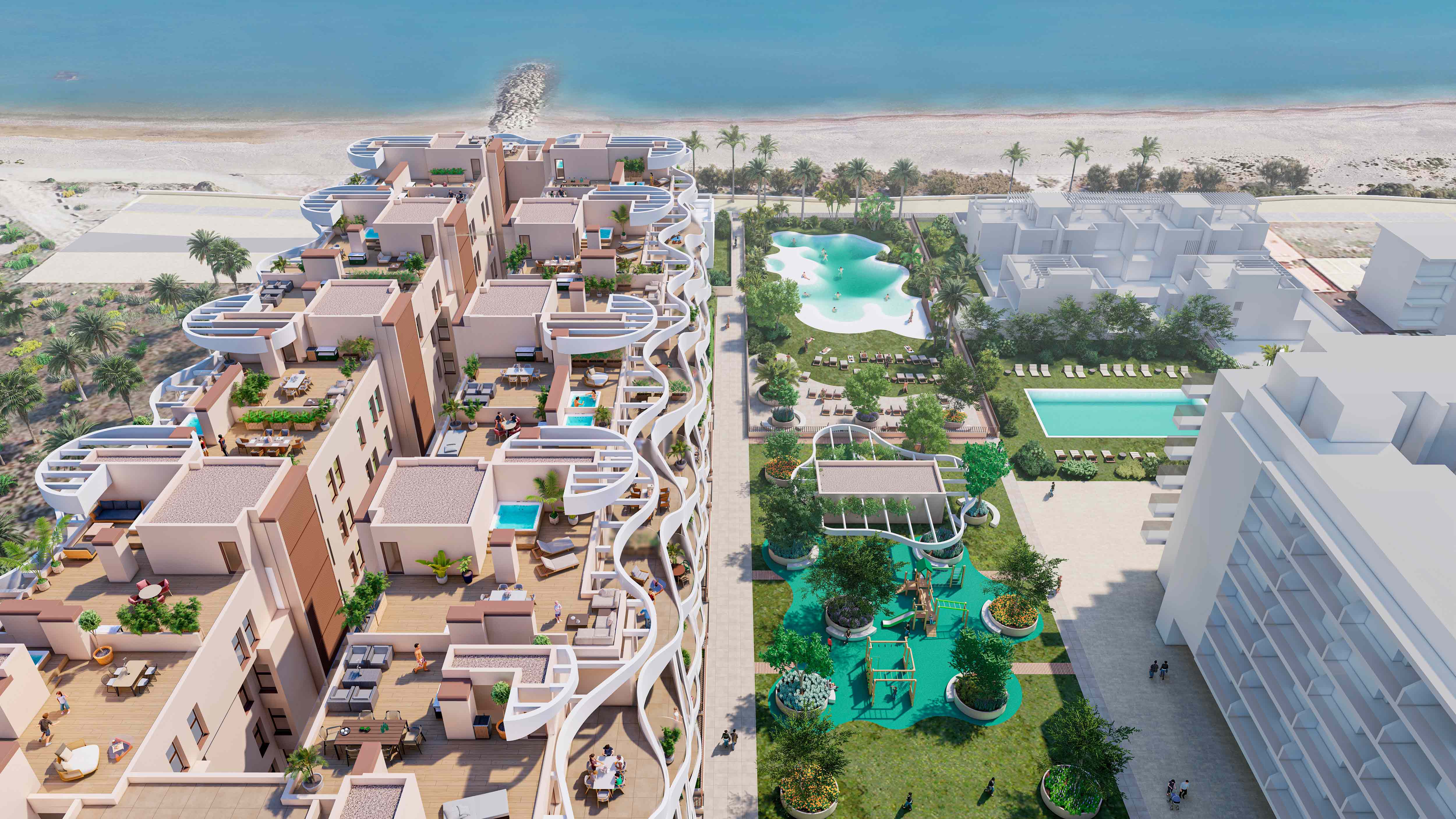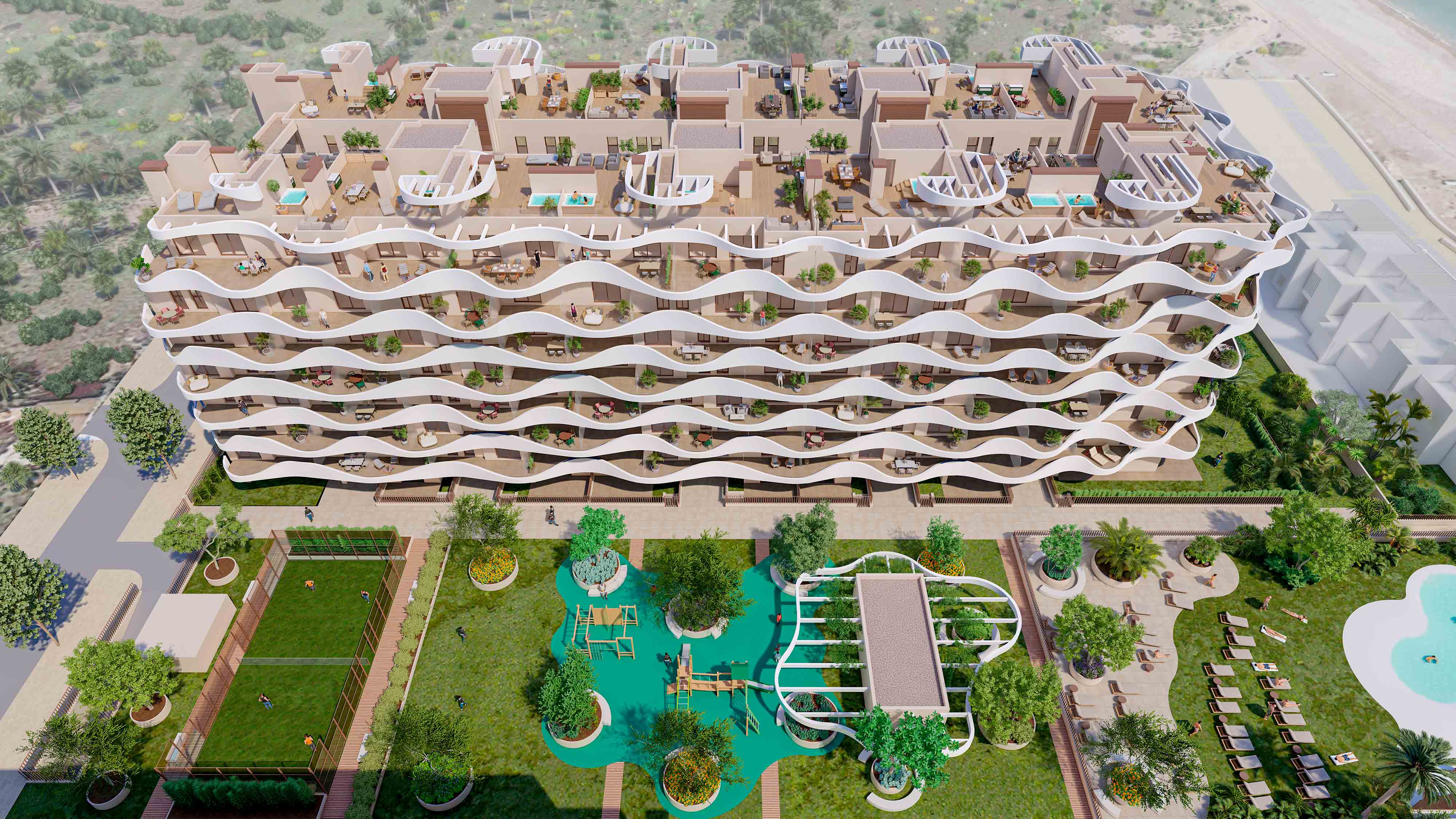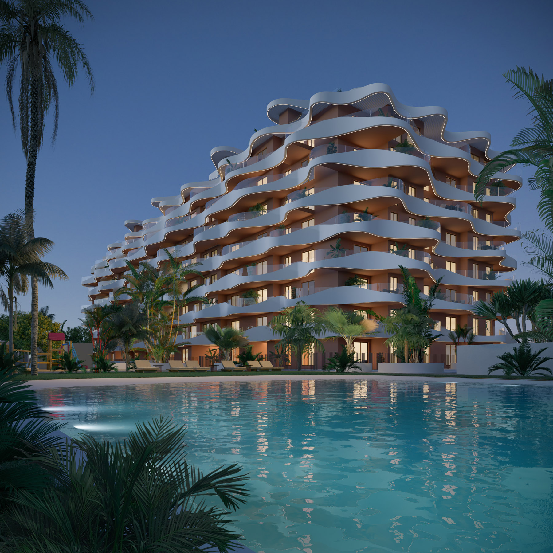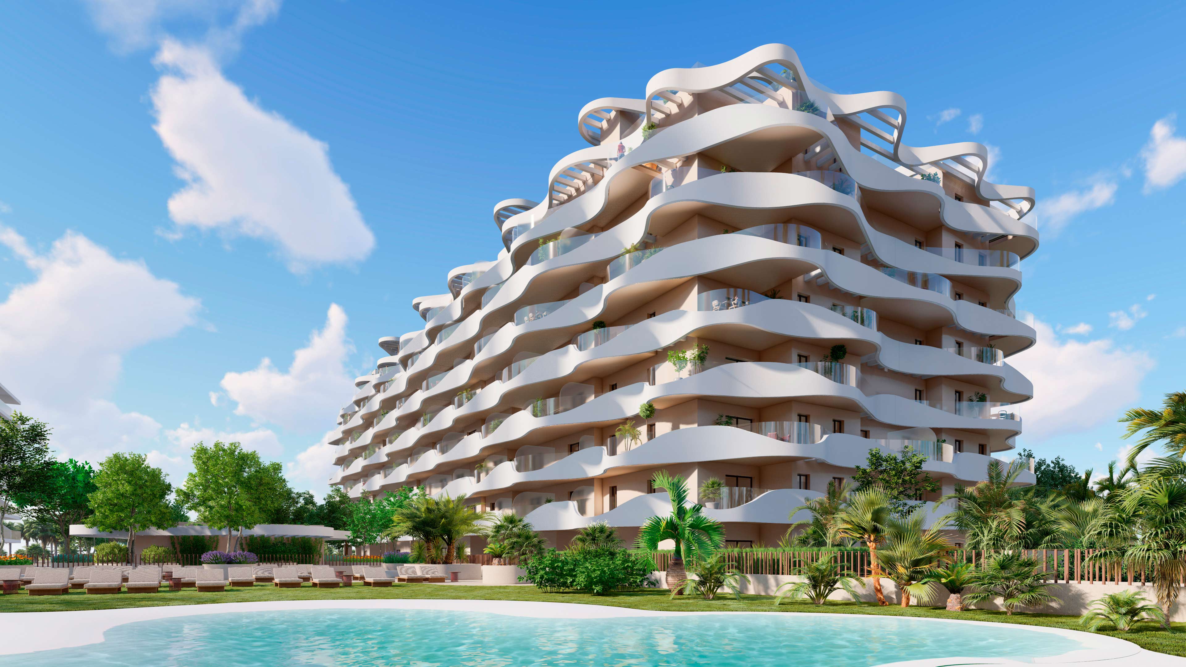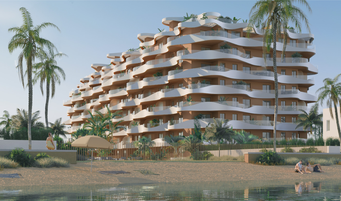 Las olas del mar han inspirado la fachada exterior, integrándolo en el espacio urbanístico de manera natural, resaltando su arquitectura única y extraordinaria.